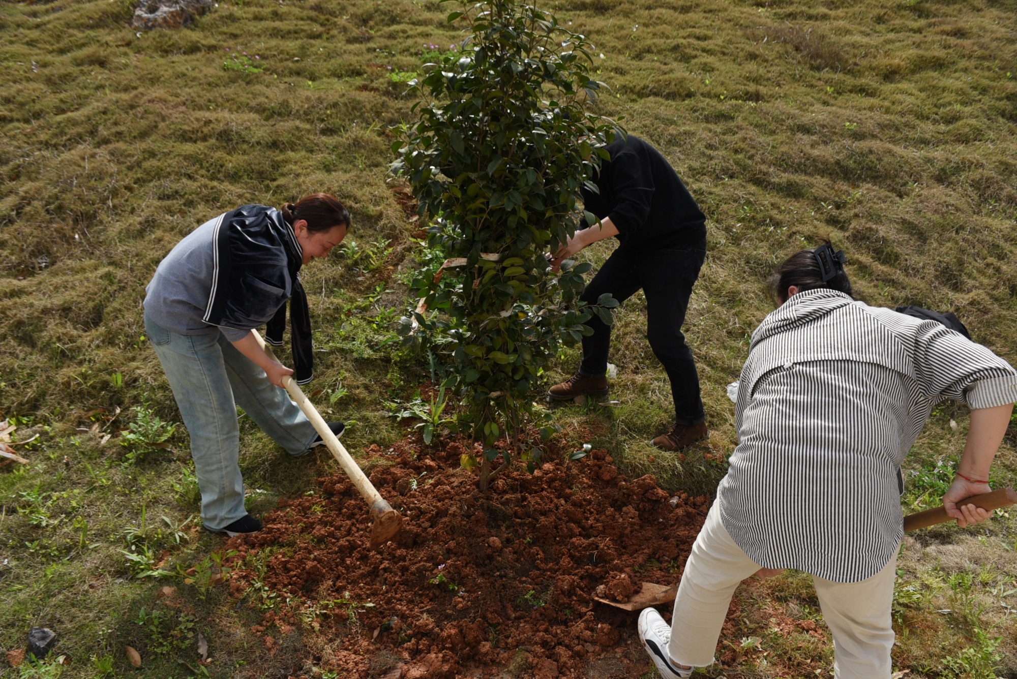 植树活动现场,师生热情高涨、齐心协力,铲土挖坑、翻土松泥、扶苗填坑、培土浇水......用辛勤劳动为这片土地种植新绿。
