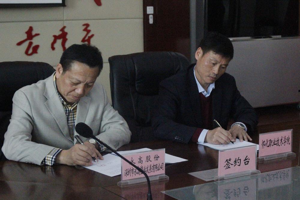 王聪田院长代表我院与永高股份深圳市永高塑业发展有限公司签订合作协议;胡佳武书记与柳国安副经理共同揭牌,永高股份深圳市永高塑业发展有限公司人才培养项目研发基地正式在我院建立。