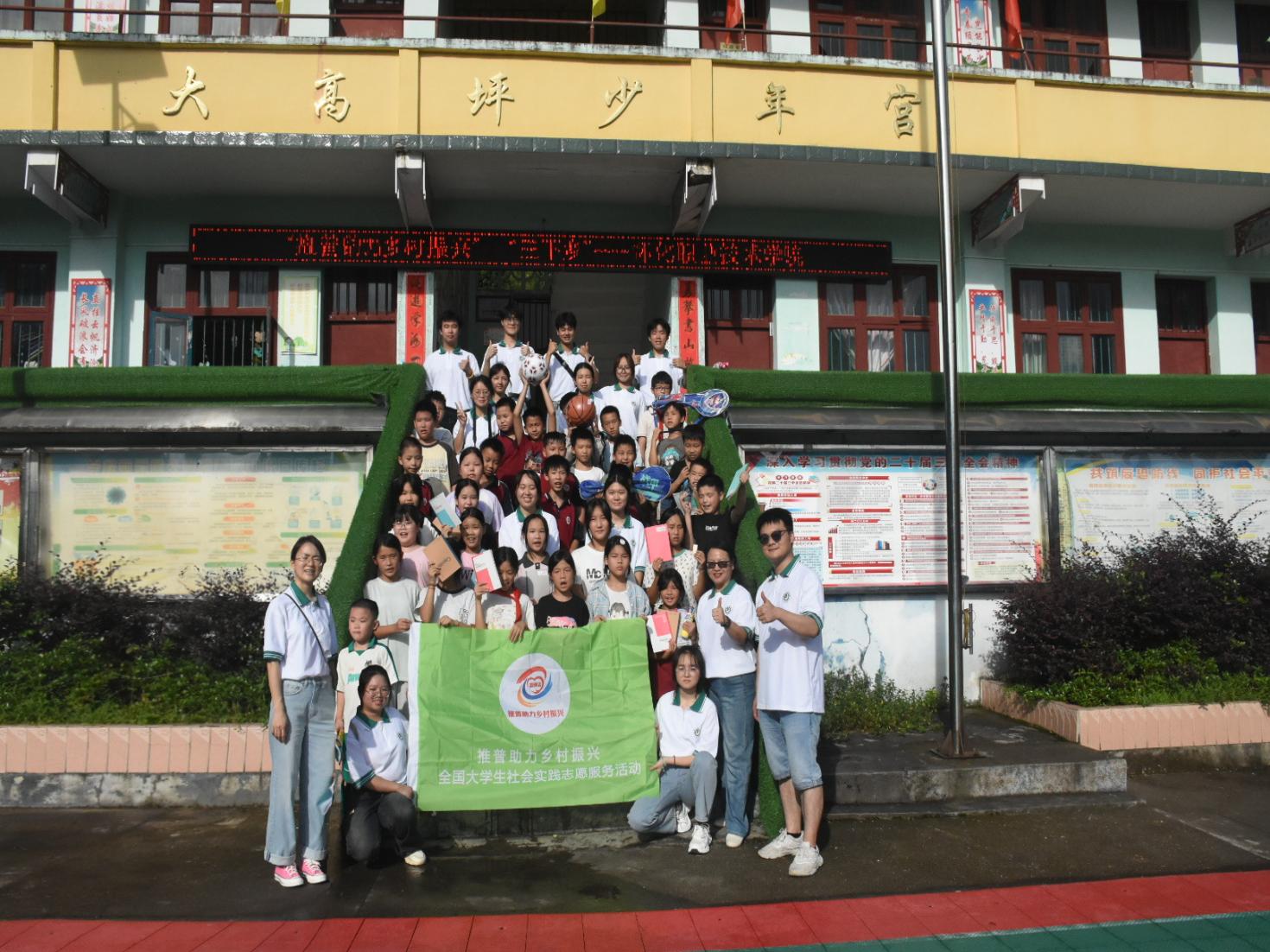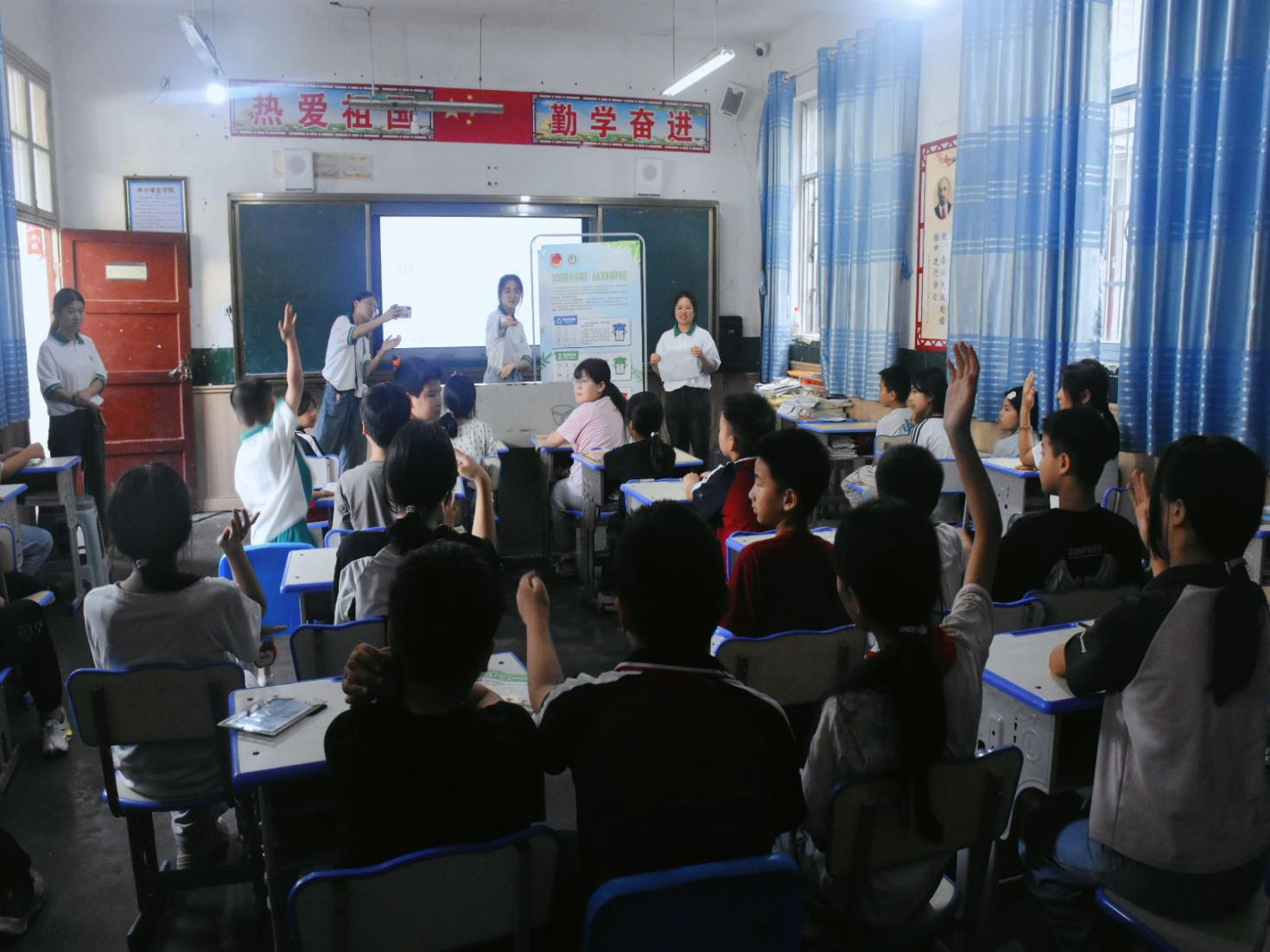 在垃圾分类知识的科普课堂中,实践团成员让小朋友们在游戏中了解垃圾分类的定义、分类的方法和分类的意义,为乡村培养一批垃圾分类小能手、小督导。实践团还以“强体魄、润语言、促均衡”为主题与在地学生开展户外体能课,队员们边推普边互动边调研,活动结束后为小朋友们赠送文体用品270余件,每一件物资都承载着对孩子们未来成长的美好期许。