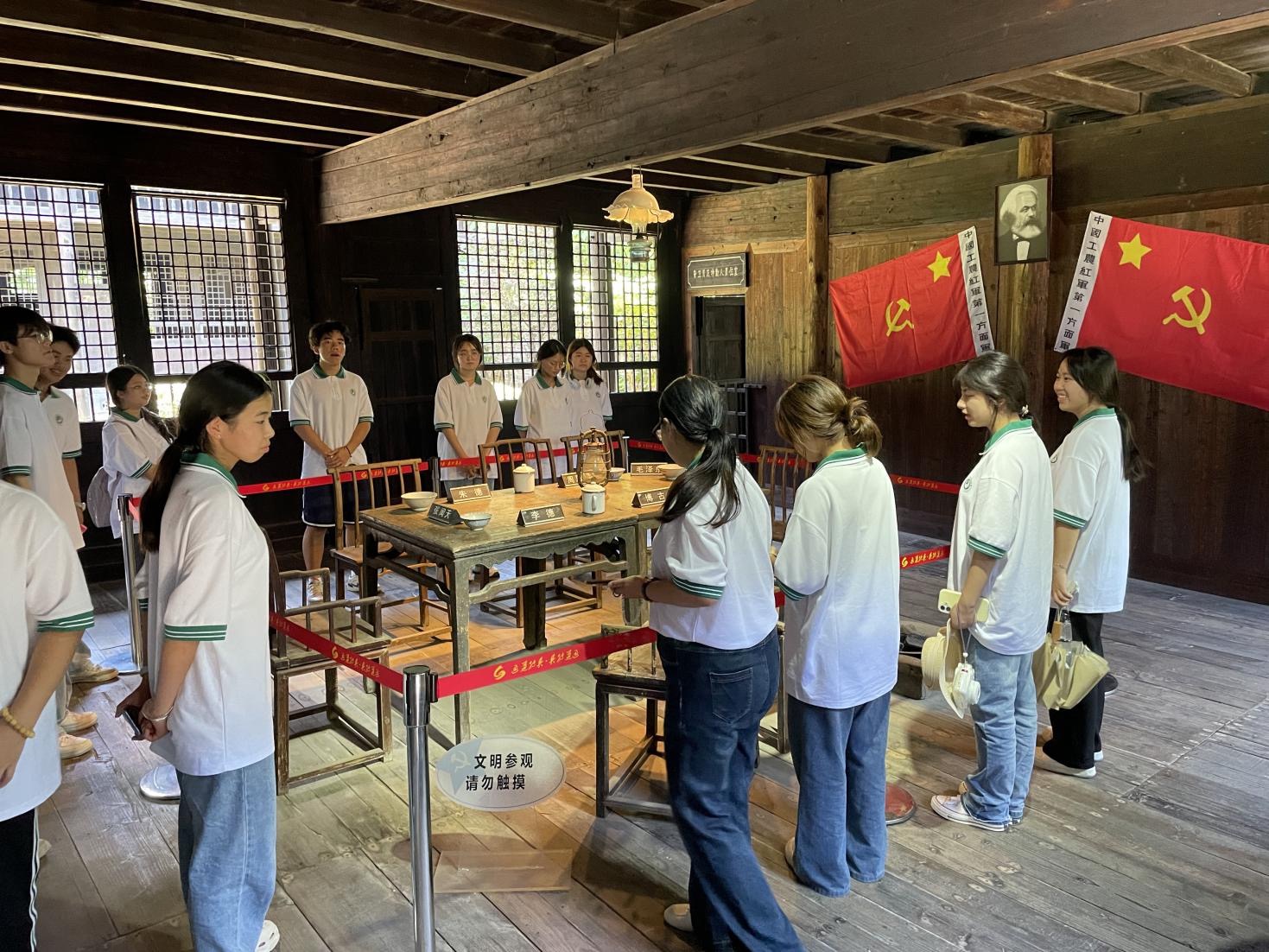 实践团最后一站来到恭城书院“通道转兵”旧址和通道转兵纪念馆,同学们聆听了《辣椒的故事》《一担皮箩的故事》《军号》等感人至深的革命故事,内心激荡着历史深处传来的回响。在陈列馆成百上千份的珍贵照片和文物面前,同学们了解了通道会议及其引发的转兵历史,对伟大长征精神有了更深刻的解读。通过沉浸式走访,追溯红色记忆、感悟民族精神,进一步凝聚团队向心力,激励师生以专业所长服务社会发展,在语言文化赋能乡村振兴的实践中践行初心使命,让青春在基层一线绽放绚丽之花。